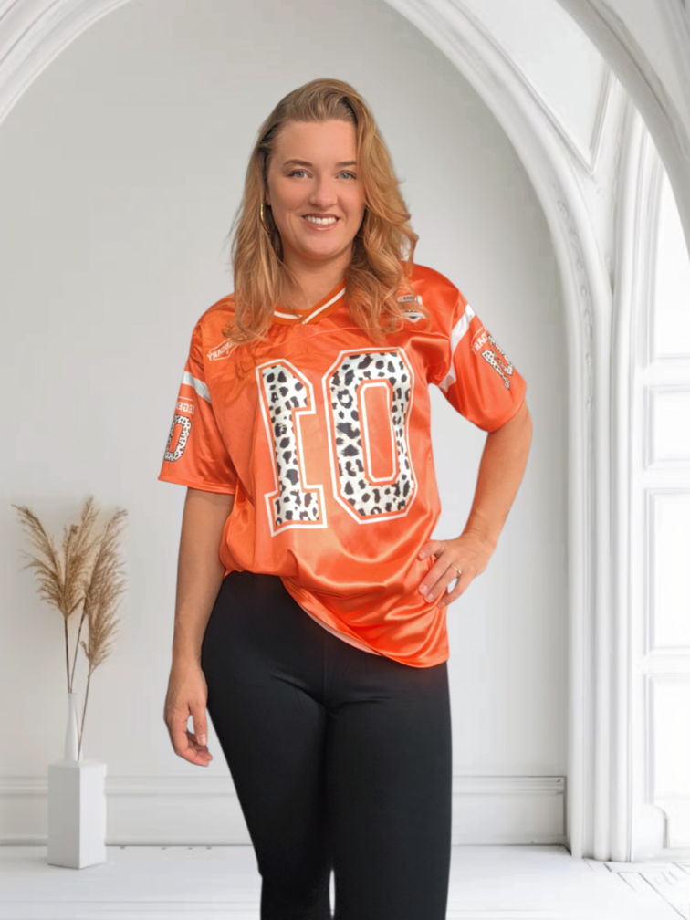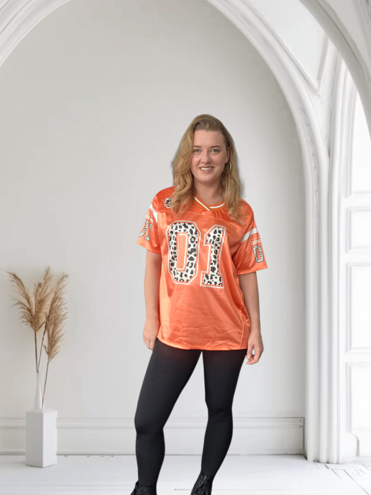 Zó leuk, dit shirt in oranje met een baseball look geeft elke outfit een leuke touch!