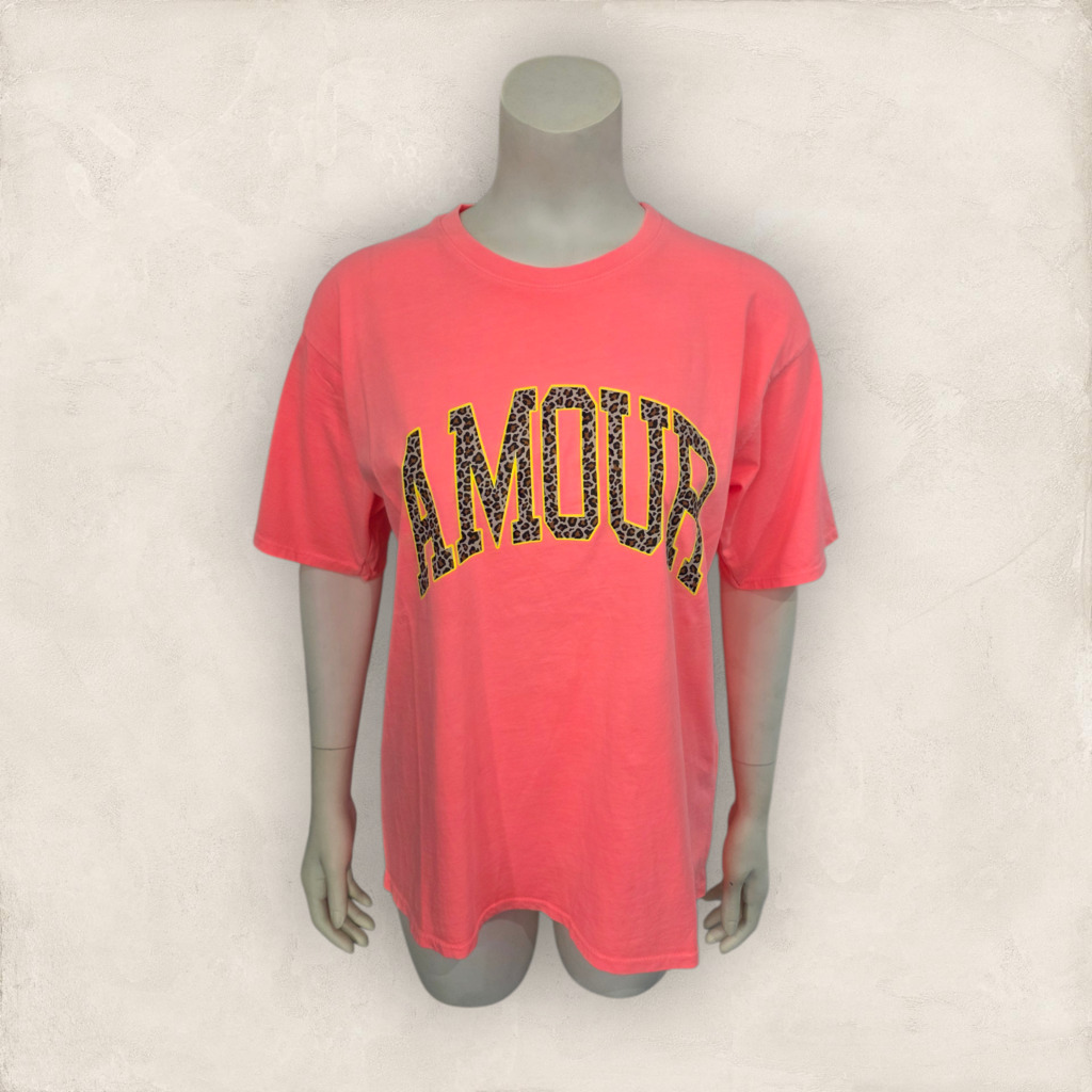 Heerlijk neon koraal t-shirt met de tekst Amour.