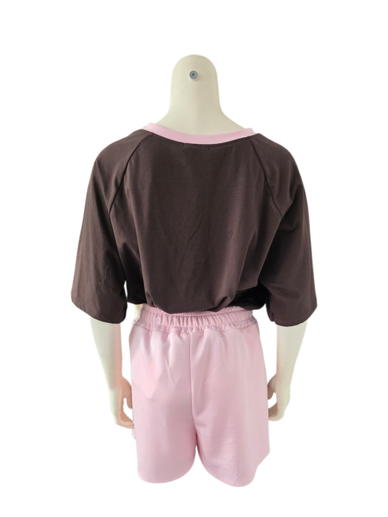 Bruin met roze tekst en hals.